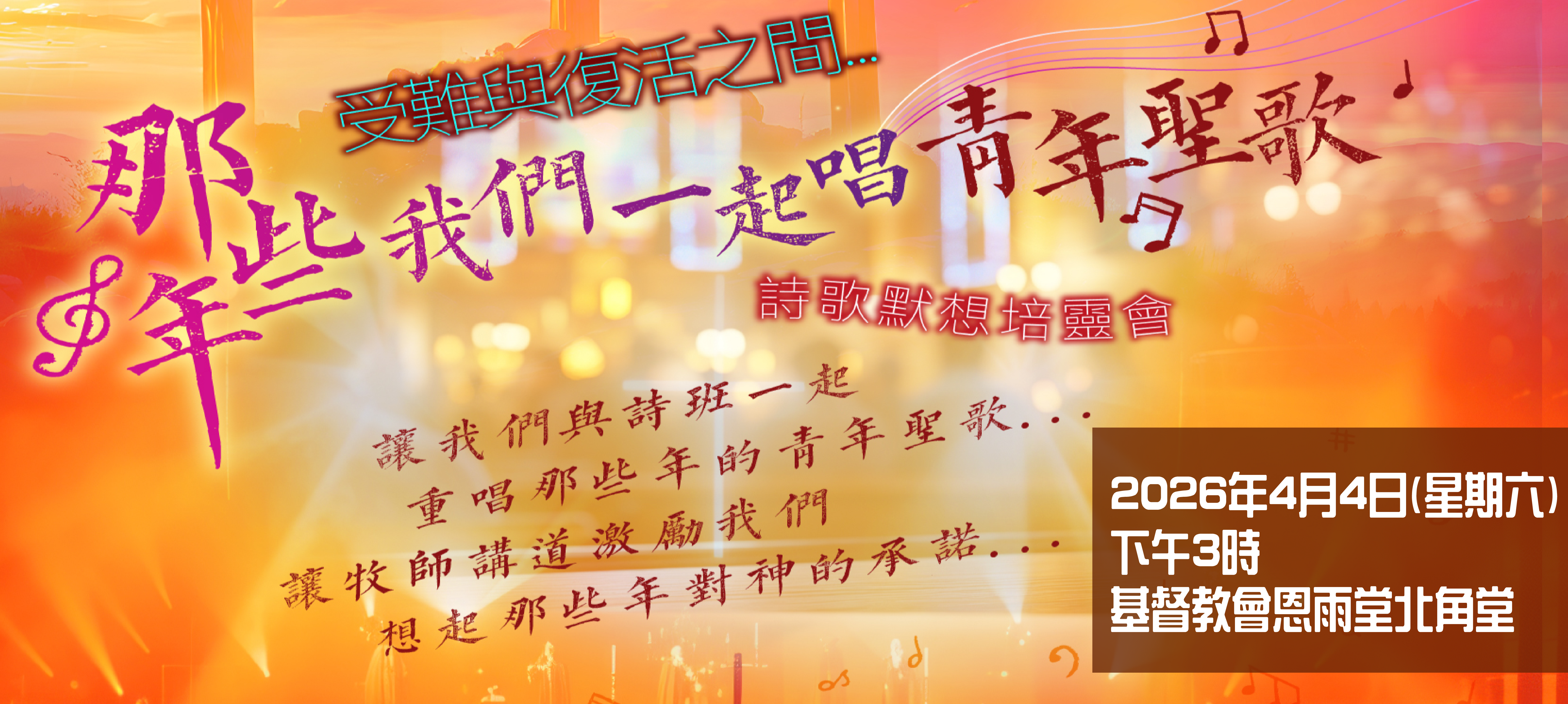 首頁bethelweb2026-03-19T11:06:48+00:00 神樂意拯救 『還是你藐視祂豐富的恩慈、寬容、忍耐,不曉得祂的恩慈是領你悔改呢?』 (羅2章4節) 敬畏神 『敬畏祢、投靠祢的人,祢為他們所積存的,在世人面前所施行的恩惠是何等大呢!』 (詩31:19) 神賜平安 『應當一無掛慮,只要凡事藉著禱告、祈求,和感謝,將你們所要的告訴神。神所賜、出人意外的平安必在基督耶穌裏保守你們的心懷意念。』 (腓4:6-7) 在主裡有喜樂 『喜樂的心乃是良藥;憂傷的靈使骨枯乾。』 (箴17:22) 最新消息 18/03/26(2026年4月4日) (那些年 我們一起唱青年聖歌) 詩歌默想培靈會 18/11/25(2025年12月14日) 恩雨堂 X Promist 聖誕Gospel 音樂會 13/11/25(2025年11月30日) 恩雨堂 x PROMIST – Gospel Vibes. Your Stage. 體驗歌唱工作坊 02/09/25(2025年9月13日) 仁愛堂X恩雨堂 – 新興運動同樂日 21/08/25(2025年10月1日) 恩雨堂秋季樂悠遊 最新活動剪影 施達赤腳行 2025 更多 2024 Watoto 聖誕佈道會 更多 2024 恩雨堂秋季大旅行 更多 2024 暑期繽Fun 同樂日 更多 2023 恩雨堂「愛與盼望」迎聖誕晚會 更多
